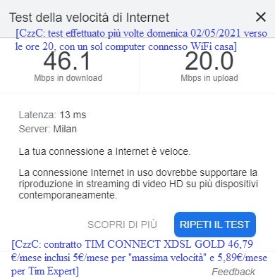 ↑2021.05.02 per il servizio ADSL+voce sul fisso di casa pago 46,79€/mese sifatti: €30,90 TIM connect xdsl gold, 1€ Timvision che non mi serve, 4€ chi è, 5,89€ Tim Expert 34ª rata di 36, e 5€ per "massima velocità", che però è di 41Mb in download e 20 in upload misurata la domenica sera: rapporto qualità/prezzo assai migliorabile, no? Quando uso il mio smartphone con Iliad come router Wi-Fi per il mio PC misuro 50 in down e 16 in up.