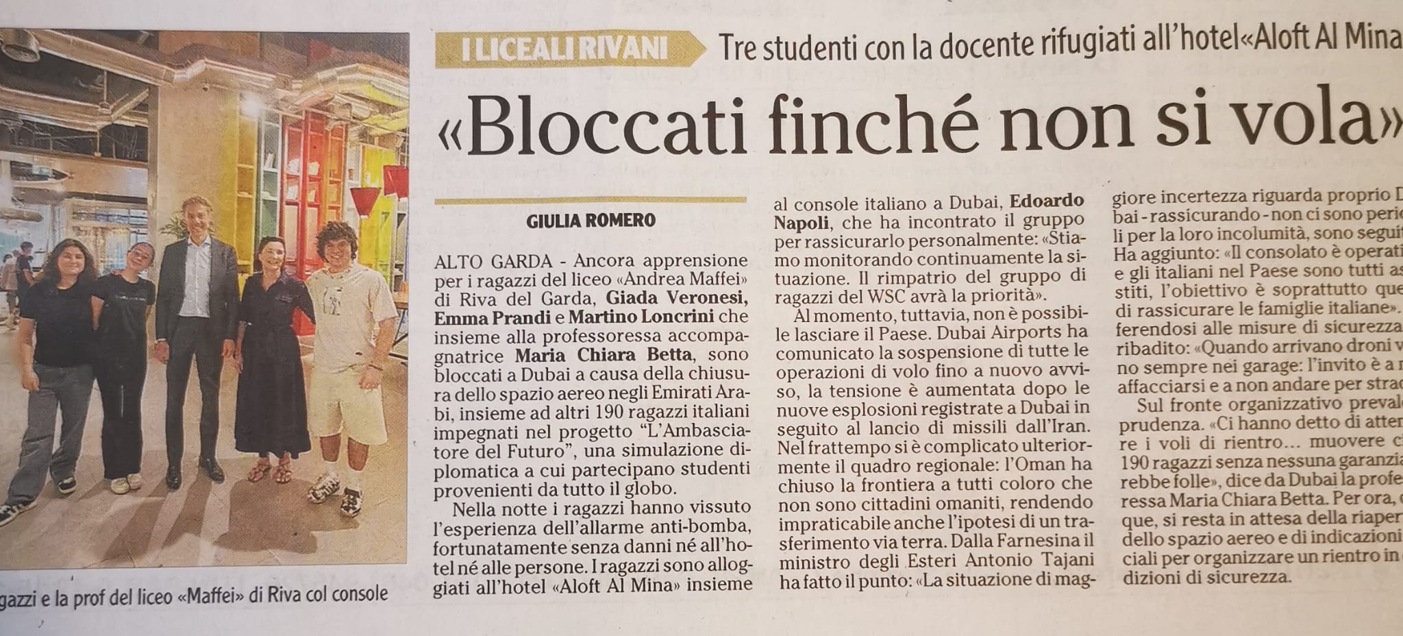 ↑2026.03.01 a causa dei bombardamenti/Iran sono rimasti bloccati a Dubai anche centinaia studenti provenienti da mezzo mondo, <rai> 204 italiani, tra cui alcuni trentini del Liceo di Riva del Garda, che avevano appena terminato ad un evento formativo del progetto «Youn United Nation Ambassador of The Future» un'attività di simulazione diplomatica, cui partecipa WSC Italia.