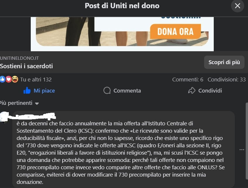 ↑2025.06.27 Sono un sostenitore delle offerte deducibili all'ICSC (Istituto Centrale di Sostentamento del Clero) che anni fa promuovevo in Parrocchia anche distribuendo in una domenica d'Avvento un centinaio di copie di Sovvenire, dopo aver spiegato dall'ambone negli avvisi settimanali la specificità di tale donazione: pochi la conoscono e pochissimi sanno che a tale donazione è dedicato un apposito rigo del 730 (attualmente il rigo E20), con valenza deducibile (significa che il rimborso fiscale avviene con la percentuale più alta applicata alla fascia di reddito personale); la deducibilità è solitamente più vantaggiosa della detraibilità spettante ad altri oneri (significa che il rimborso fiscale sarebbe al massimo il 19%).