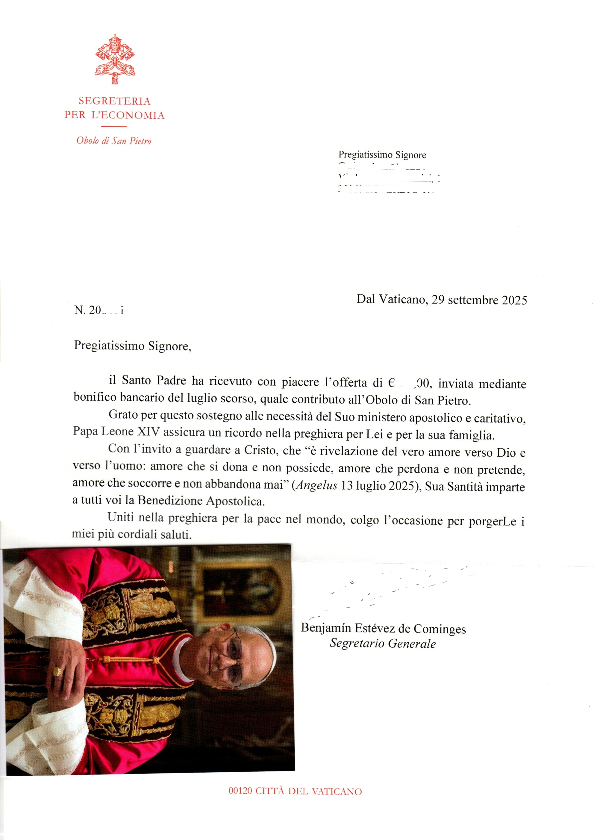 ↑2025.10.14 un grazie da Obolo di San Pietro.