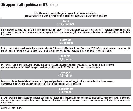 ↑2018.02.04 <twimg> i partiti italiani nel 2011 hanno incassato 189 M€ di rimborsi elettorali. In Germania il tetto massimo di finanziamento ai partiti è fissato in 133M€ (e la De ha 82,8/60,2=36% di abitanti in più dell’Italia); in Fr max 75M€ di spesa partiti, max 38k€/candidato contro i 52k€/c in Italia. Sp 45M€, Uk 10M€.