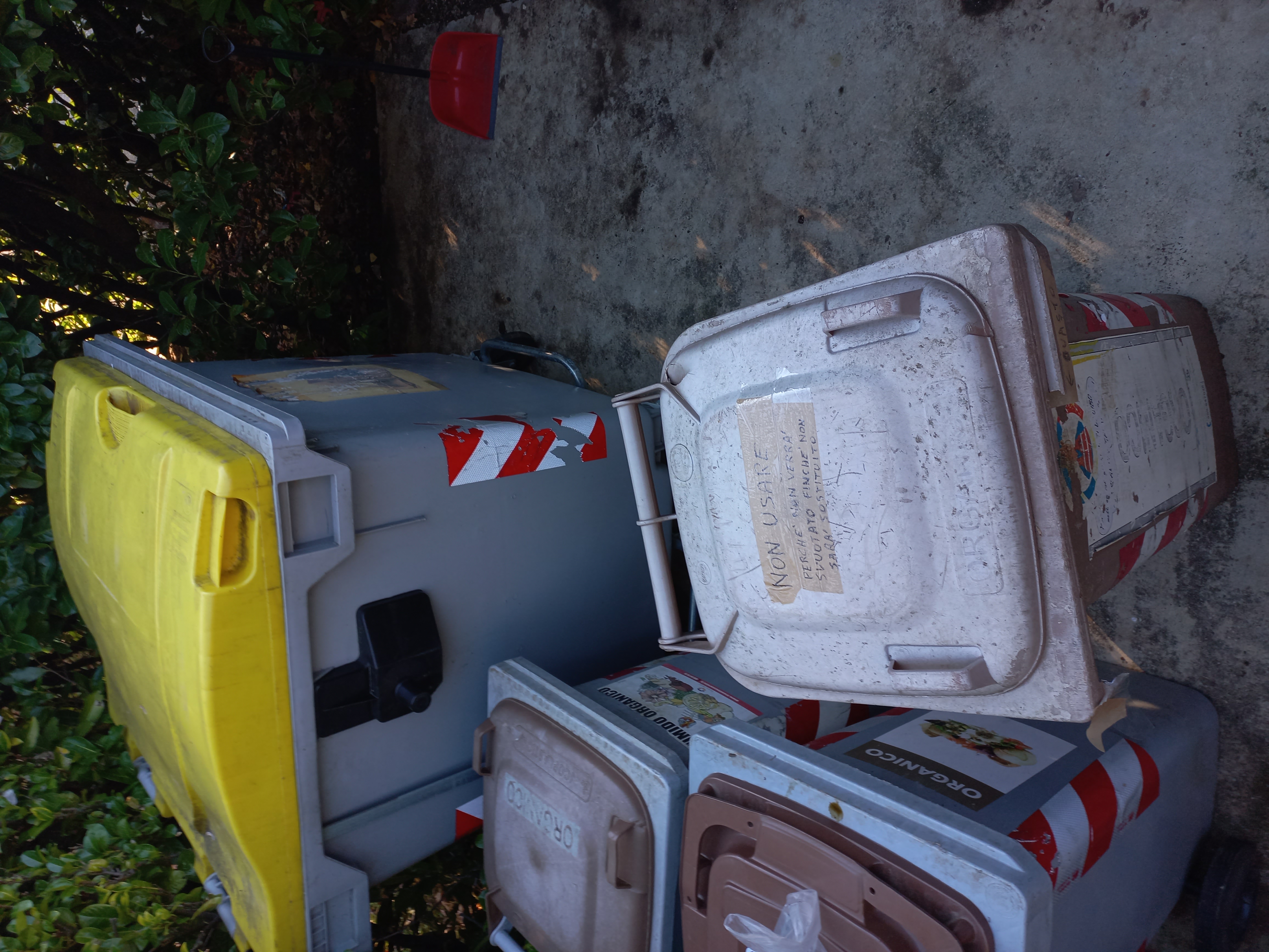 ↑2025.11.18 mentre stavo facendo pulizia dell'isola ecologica condominiale è arrivato l'autocompattatore per lo svuotamento dei 3 bidoni condominiali del rifiuto organico: l'operatore ecologico ne ha svuoto solo due, spiegandomi che il terzo è guasto (si era staccato un pezzo di plastica dal bordo superiore frontale) per la qual cosa non lo avrebbero più svuotato finché non sarà stato sostituito, e precisa di aver già segnalato il guasto. Lascio immaginare quanta puzza e quanti vermi e bigattini abbondano nel liquame che residua nel bidone (non so da quanto tempo, perché io non conferisco lì il mio organico: lo porto nella compostiera del mio orto). Ho apposto sul coperchio del bidone guasto una scritta per invitare i condomini a non usare nel frattempo quel bidone.