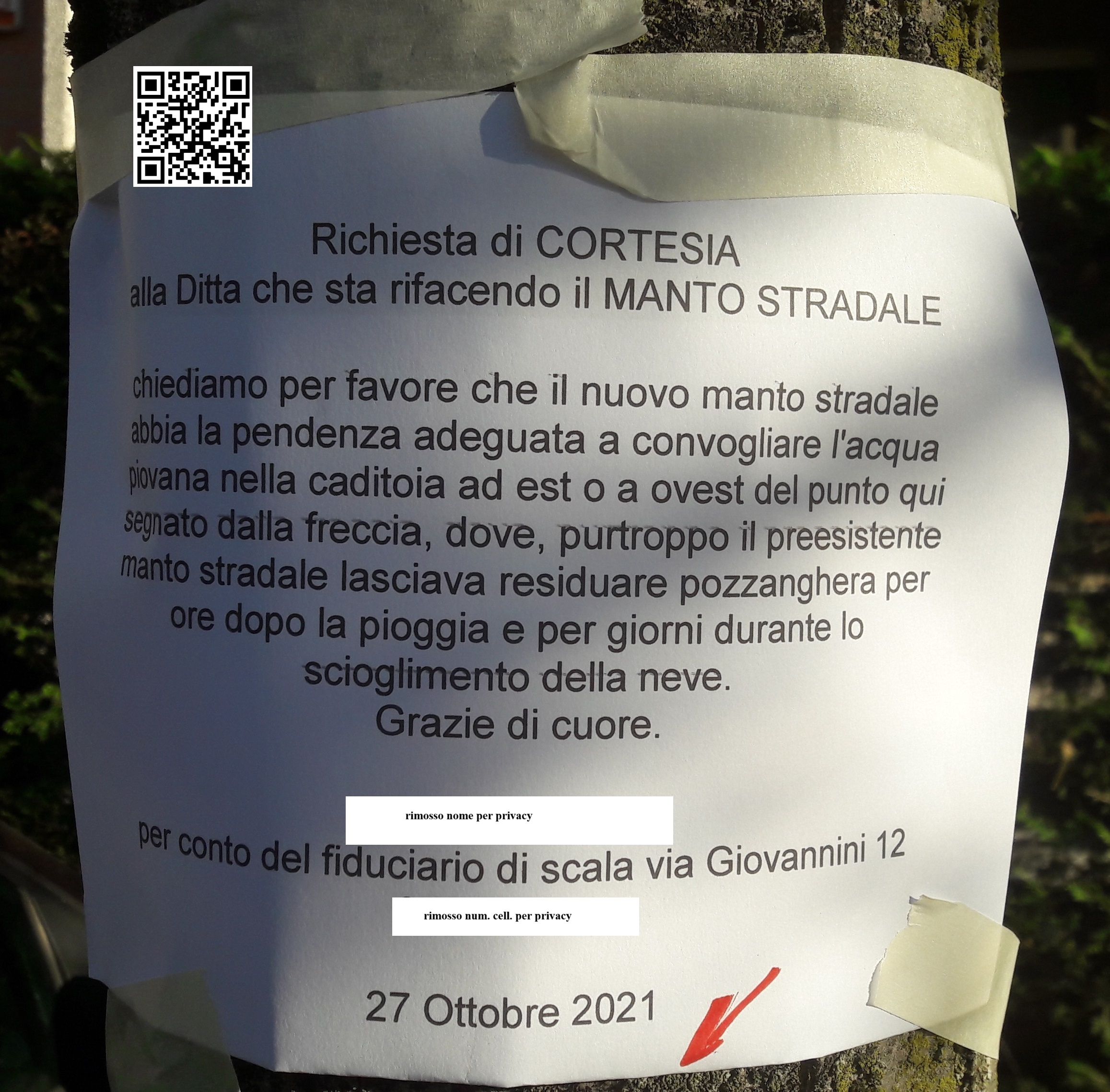 ↑2026.02.03 per un tratto di circa 8 metri di una strada comunale il manto d'asfalto presenta un avvallamento che impedisce il deflusso dell'acqua piovana verso le caditoie stradali site ad est e a ovest dello stesso, dal che, quando piove o si scioglie la neve, ristagna un'ampia pozzanghera anche dopo ore di sole: è comprensibile il disagio per le persone che in tal caso debbono passare in quel tratto di strada. Nel 2021 chiedemmo cortesemente alla ditta che stava rifacendo il manto d'asfalto di colmare l'avvallamento creando pendenza verso le caditoie, ma la richiesta fu ignorata, anzi, il problema si aggravò. Come aiutarne la soluzione?
