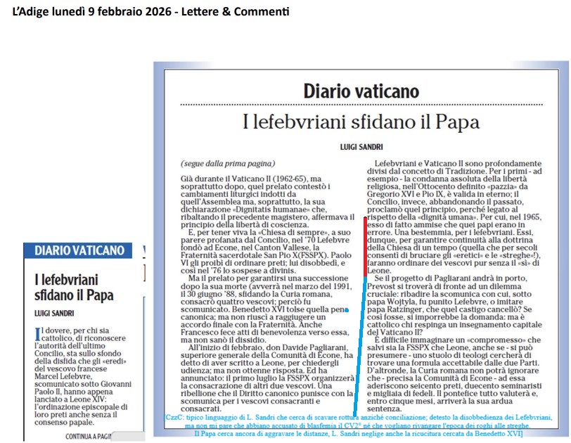 ↑2026.02.09 i Lefebvriani prospettano ordinazione episcopale che potrebbe prescindere dal Papa, il che sarebbe un danno da evitare per la fraternità cattolica, ma a Luigi Sandri piace dipingere rottura, anziché sperare conciliazione, e scrive così su <l'Adige> ... continua qui con #Lefebvriani, #CV2°, #Dignitatis Humanae, #streghe, #GP2°, #B16°, #Santa Sede, #inquisizione, #dissenso verso il Papa, Dicastero per la dottrina della fede, Et voilà l'#ermeneutica di rottura!]