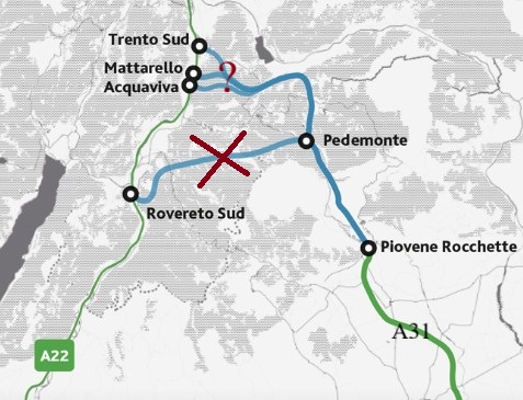 ↑2025.10.24 è da decenni che prevedevo che potesse trattarsi di una carta da bruciare l'ipotesi che la autostrada A31 arrivasse in Vallagarina, perché fin da ben prima che fossero disponibili le mappe digitali avevo visto sulle carte geografiche tratteggiato il collegamento autostradale tra Piovene Rocchette e Trento. <l'adige> conferma.