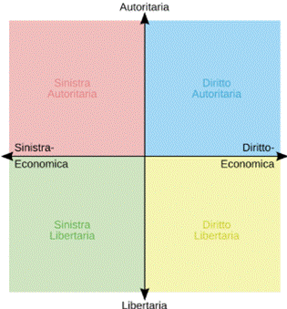 Schema bidimensionale (con asse socio-economico orizzontale e un asse socio-culturale verticale) in alternativa al vecchio clivage destra-sinistra: a me piacerebbe un terzo asse, quello etico-religioso con la differenza tra reato e peccato, fermo restando che la vera politica abbisogna della partitica ma non vi coincide, anzi!