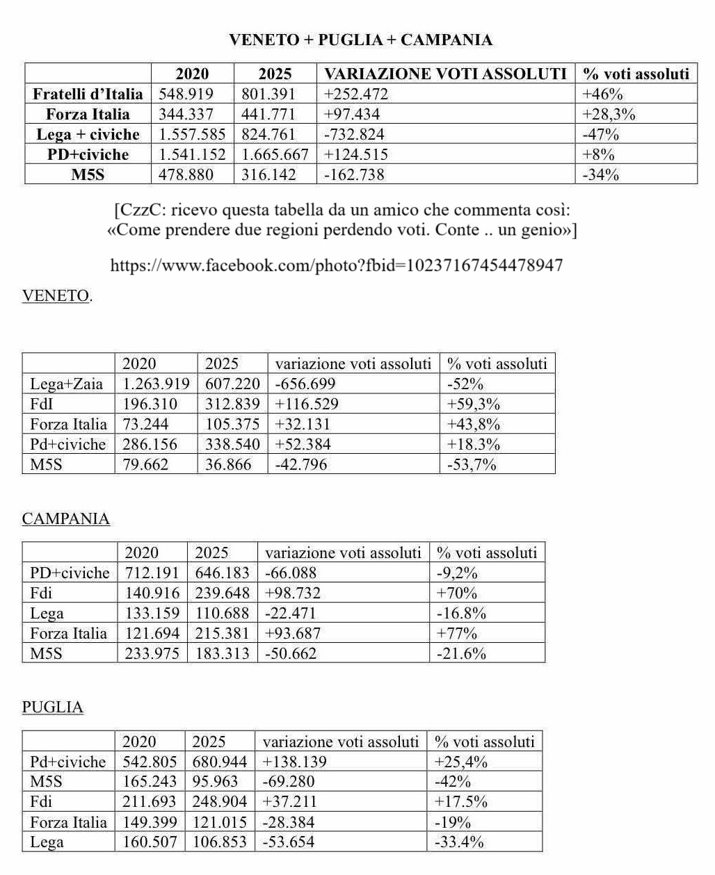 ↑2025.11.25 elezioni regionali 2025: 3+3+1; in Puglia: trionfa Decaro <fq> Nichi Vendola con AVS resta fuori dal Consiglio regionale. Alberto Stefani eletto in Veneto. Roberto Fico eletto in Campania. Francesco Acquaroli era stato confermato 28/9 nelle Marche; qui le 3 regioni. Roberto Occhiuto era stato confermato 6/10 in Calabria; Eugenio Giani era stato rieletto 13/10 in Toscana; Renzo Testolin 28/9 confermato 6/11 in Valle d'Aosta. 13/cd a 6/cs attualmente le regioni.