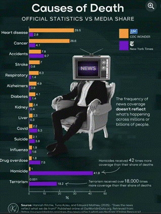 che l'amico NC commenta così: Cause di morte (arancio) e copertura mediatica (viola) ... Gli omicidi rappresentano 1% delle cause di morte, ma il 42% della copertura mediatica; le morti per terrorismo lo 0,001% e il 18% della copertura. La copertura provoca una distorsione della realtà percepita.