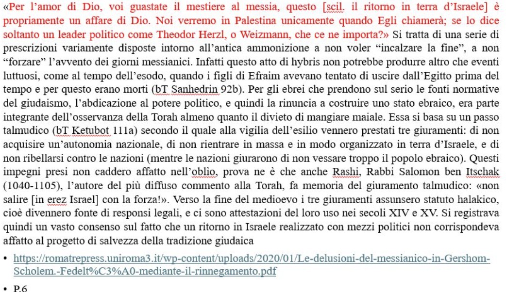 ↑2025.12.12 Agnoli spiega che gran parte dell'ebraismo religioso di fine Ottocento nutriva avversione nei confronti del sionismo. I primi sionisti erano nazional-socialisti; Moses Hess, amico di Marx coniò l'espressione "religione oppio dei popoli". Agnoli cita l'antisionismo ebraico, tra cui l’ebreo religioso antisionista Jacob Israël de Haan che viene ucciso nel 1924 da terroristi sionisti che poi accusano dell’omicidio gli arabi: la formazione di uno Stato ebraico in senso tradizionale, prima dell’era messianica, sarebbe considerata dai "buoni ebrei" una trasgressione della Halachà: <foto1, foto2>.