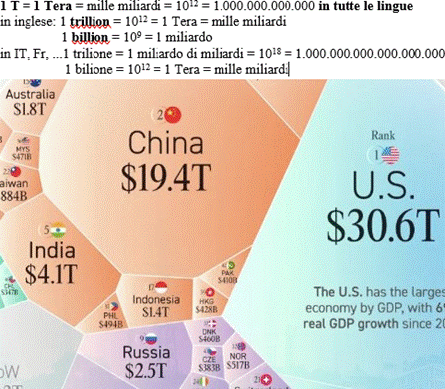 USA 30,6 T$, Cina $19,4T, Germania $5,0T, Giappone $4,3T, India $4,1T, UK $4,0T, Francia $3,4T, Italia e Russia $2,5T, Brasile e Canada $2,3T. [CzzC: non a caso questo grafico esprime i valori con unità di misura T=Tera: suggerirei di usare il TERA come prefisso moltiplicativo, anziché parlare di trilioni, termine equivoco perché in italiano un trilione significa un miliardo di miliardi, cioè molto di più del trillion che in inglese vale mille miliardi, come il Tera].
